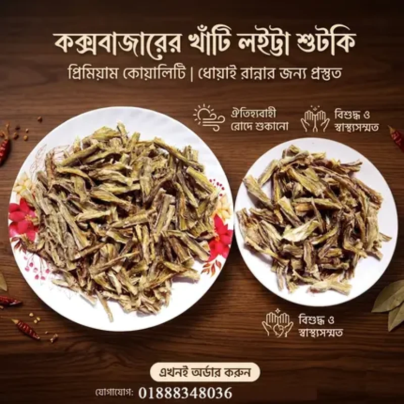 এখানে একটি প্রিমিয়াম কোয়ালিটির লইট্টা শুটকির ছবি থাকবে। পাশে ছোট করে বিশেষত্বগুলো লেখা থাকবে: